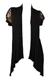 Add some style to your wardrobe with this beautiful plus size cardigan. Plus size cardigan features short sleeves and asymmetric bottom design. Gorgeous lace fabric accents the sleeves and upper back area. Open front design. Rayon blend fabric. Avail