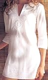 A plus size knit tunic with lovely crochet details! Cotton/polyester. Machine wash. Imported. Scoop neck 3-button Henley placket Bib front with tonal crochet Rib trim at neck, sleeve openings and empire waist Shirring below empire waist Side slits Ab