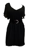 Available in junior plus size 1XL, 2XL, 3XL. This gorgeous plus size dress features short sleeves with wide v-neck line. Lined. Sheer chiffon fabric. Rhinestone belt detail. Two front pockets. Sexy split back styling with single button closure on top