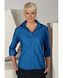 65% Polyester/35% Cotton; 4.0 oz. wt. Feminine silhouette with open neckline and narrow placket, 16 colors, soft collar and matching buttons, 3/4 sleeve with notched cuff detail, Fade, shrink and wrinkle resistant, Machine washable. Women's sizes: XX
