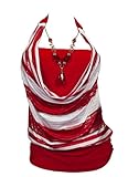 Plus size top features sleeveless halter design with o-ring accented self tie off straps. Beaded chain necklace accent. Layered look with glitter stripe on the outer layer. Thick banded hemline. Available in Black, Red, Blue and Purple color choices